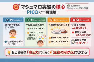 前回は以下 Contents1 論文の題名とリンク2 PICO/PECO2.1 P(Population:対象)2.2 I(Intervention:介入)2.3 C(Comparison:比較)2.4 O(Outcom … 続きを読む マシュマロテストの論文とその後をGoogle NotebookLMに解説してもらう【Mischel, 1972】