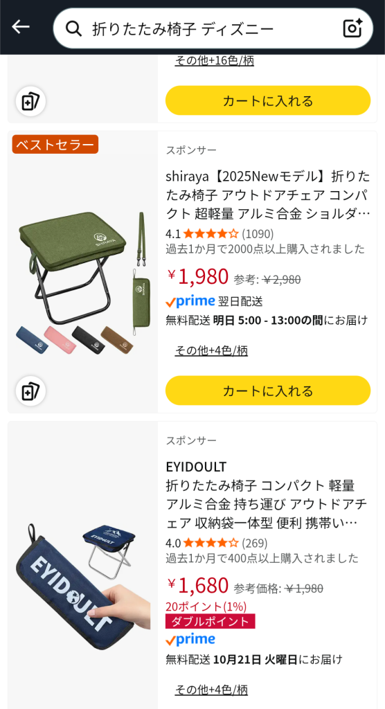 周りの人も気になります。なんか、小さい持ち運び用の椅子に座っている方がいたので、「折りたたみ椅子、ディズニー」で検索すると、以下のようなものが出てきました。4 つは重いかなぁ、、、