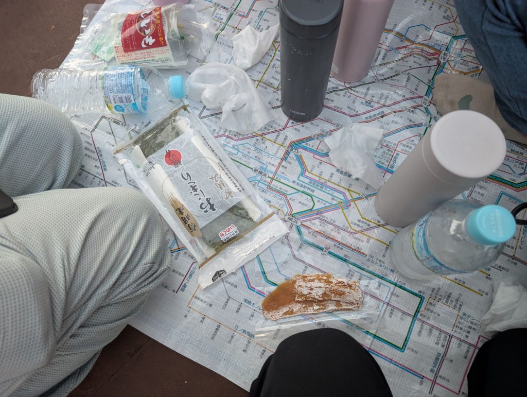 ビニールシートの上で朝食です。