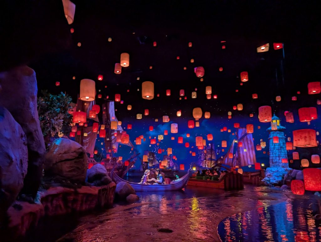 快晴で、最初は外でまぶしかったですが、その後、屋内に入り、きれいなたくさんのランタンに囲まれたラプンツェル達を見ました。とてもおだやかでした。ディズニーランドの、「イッツ・ア・スモールワールド」と雰囲気が似ていました。