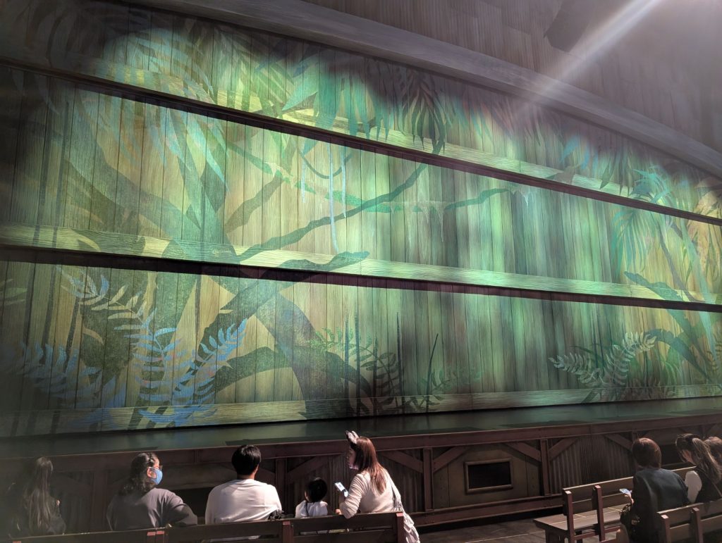 1328 ドリームス・テイク・フライトの劇場に入り、着席(DPAで予約、4人で10000円)。A-6-9〜12の席でした。