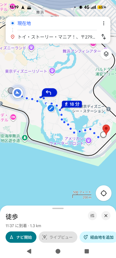 1115 レストランを出発。ファンタジースプリングスの「アレンデール・ロイヤルバンケット」から、トイ・ストーリーマニアまで、Google マップで見ると、なんと徒歩20分もかかるとのことでびっくりしました。ディズニーシー広すぎ!