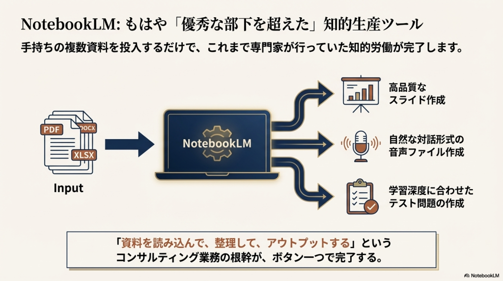 これ、教育産業やコンサルティング業務の根幹を揺るがす機能です。「資料を読み込んで、整理して、アウトプットする」という、これまで人間が高給を得ていた知的労働の大部分が、ボタン一つで完了してしまいます。