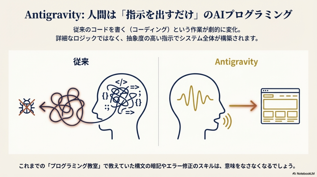 プログラミング教育の概念崩壊そして極めつけが、Antigravityです。従来のコードを書く(コーディング)という作業が劇的に変化しました。詳細なロジックを人間が記述するのではなく、抽象度の高い指示でシステム全体が構築されていく。これまでの「プログラミング教室」で教えていた構文の暗記やエラー修正のスキルは、このツール前ではあまり意味をなさなくなるでしょう。