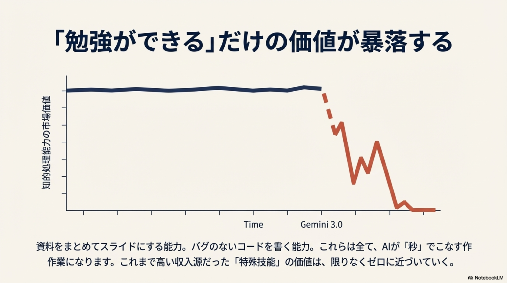 しかし、Gemini 3.0の進化を見せつけられた今、痛感します。単調な事務「処理能力」の価値は、限りなくゼロに近づいていく、と。資料をまとめてスライドにする能力も、バグのないコードを書く能力も、これまでは「特殊技能」として高い収入源になっていました。しかし、これらは全てAIが「秒」でこなす作業になります。