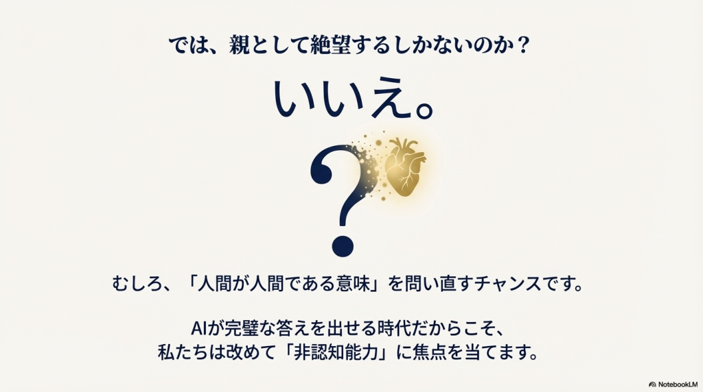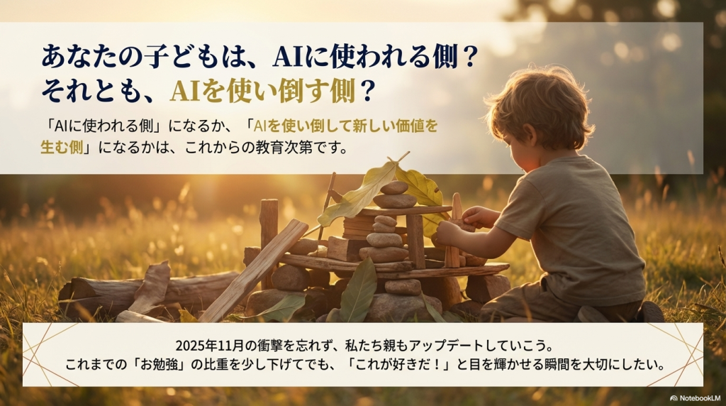 NotebookLMは完璧な答えを出しますが、「何を解決すべきか」「どの資料を読み込ませるか」を決めるのは人間です。子どもには「正解を答える練習」よりも、「何が面白いか?」「何が問題か?」を発見する好奇心を育てたいと思います。