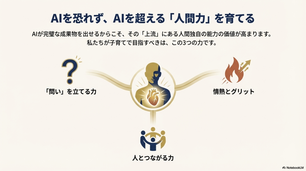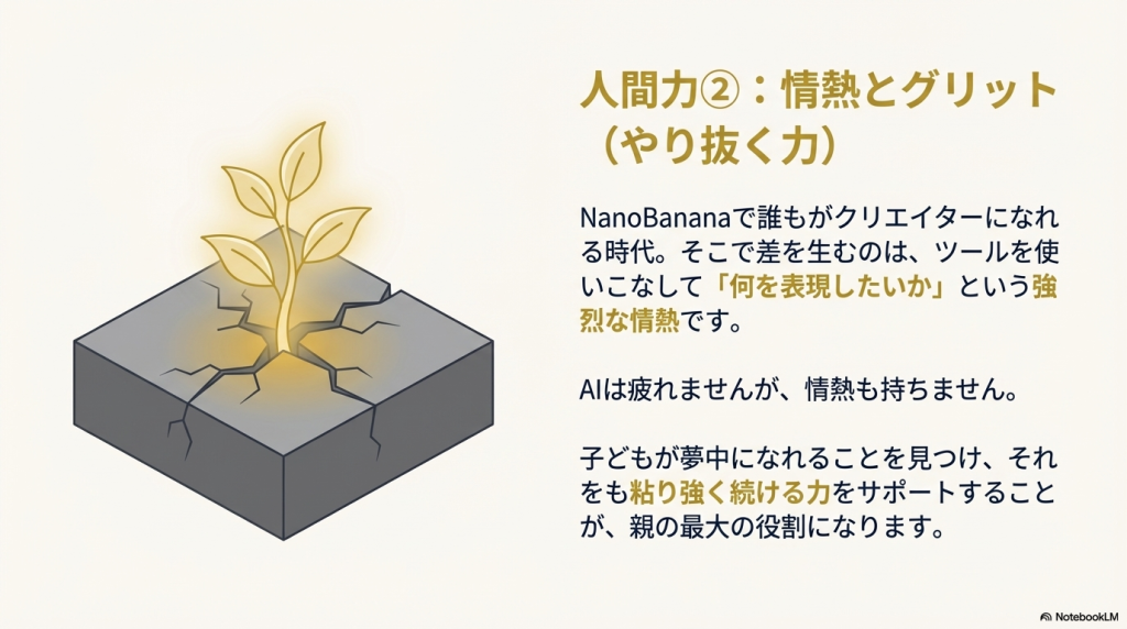 です。AIは疲れませんが、情熱も持ちません。子どもが夢中になれることを見つけ、それを粘り強く続ける力をサポートすることが、親の最大の役割になります。