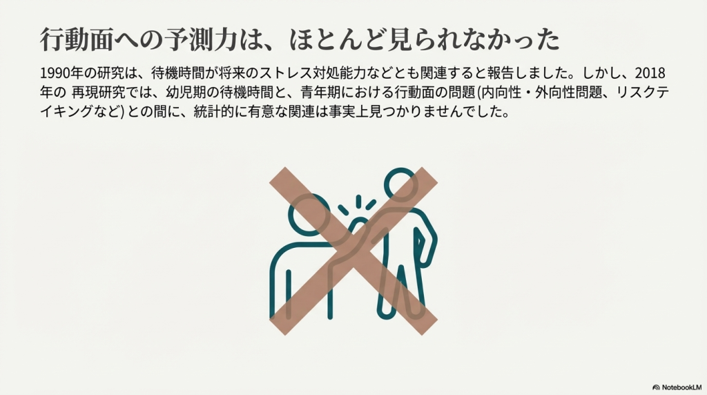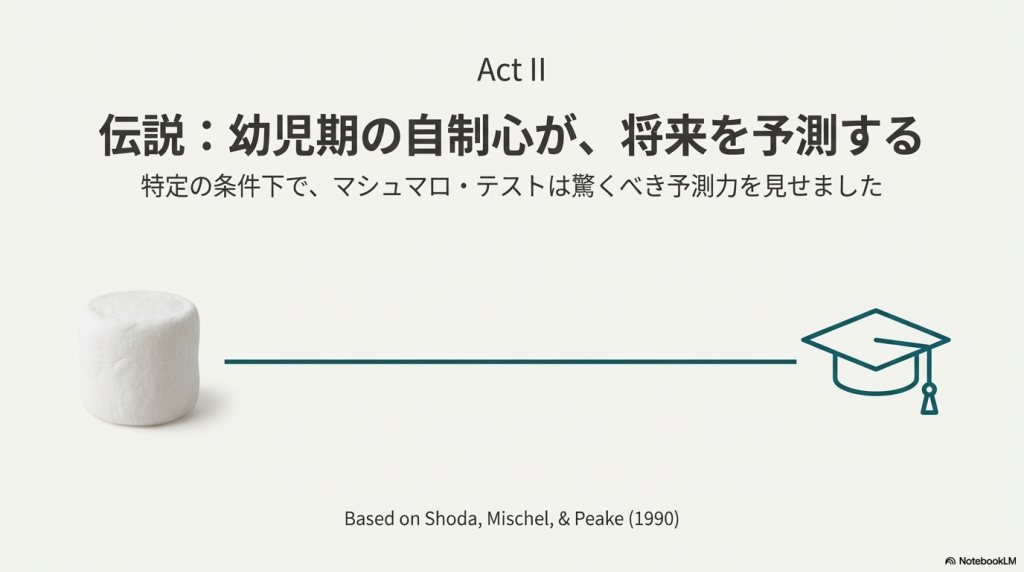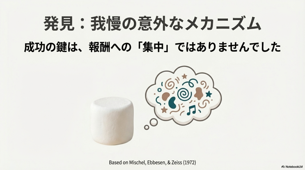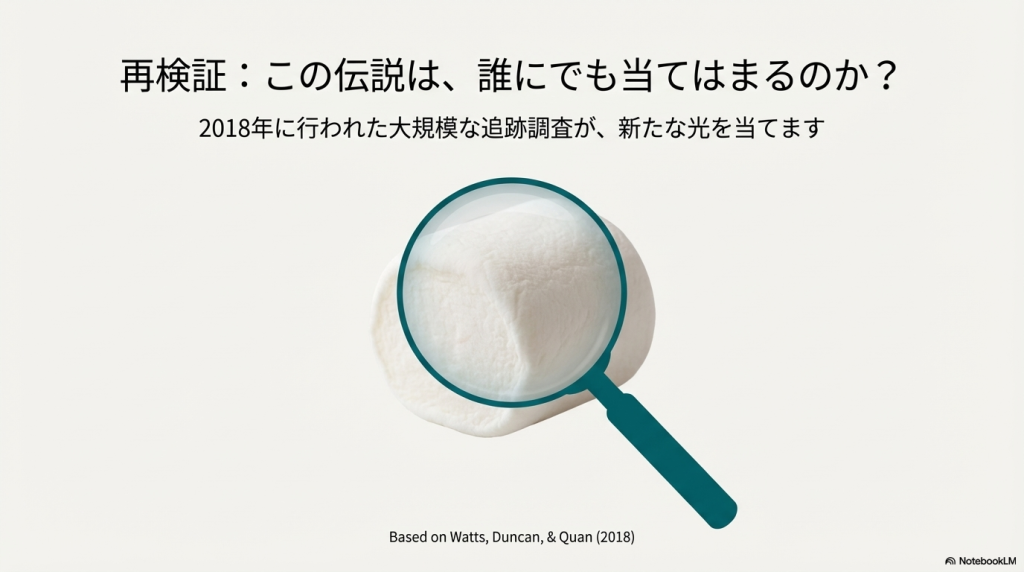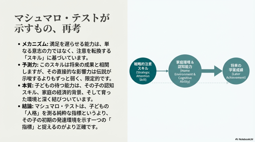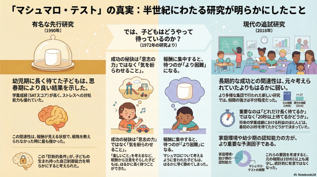 これらの研究は、まず「どうすれば待てるか(1972年)」というメカニズムの解明から始まり、次に「待てる能力が将来を予測するか(1990年)」という長期的な相関の提示、そして最後に「その相関は環境要因を考慮しても成立するか(2018年)」という批判的検証という流れで発展してきました。