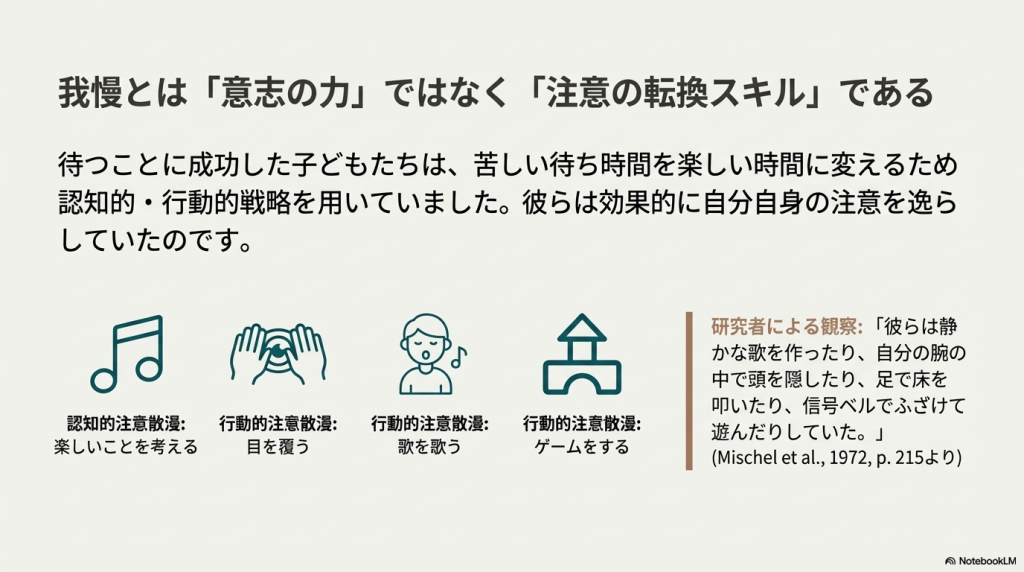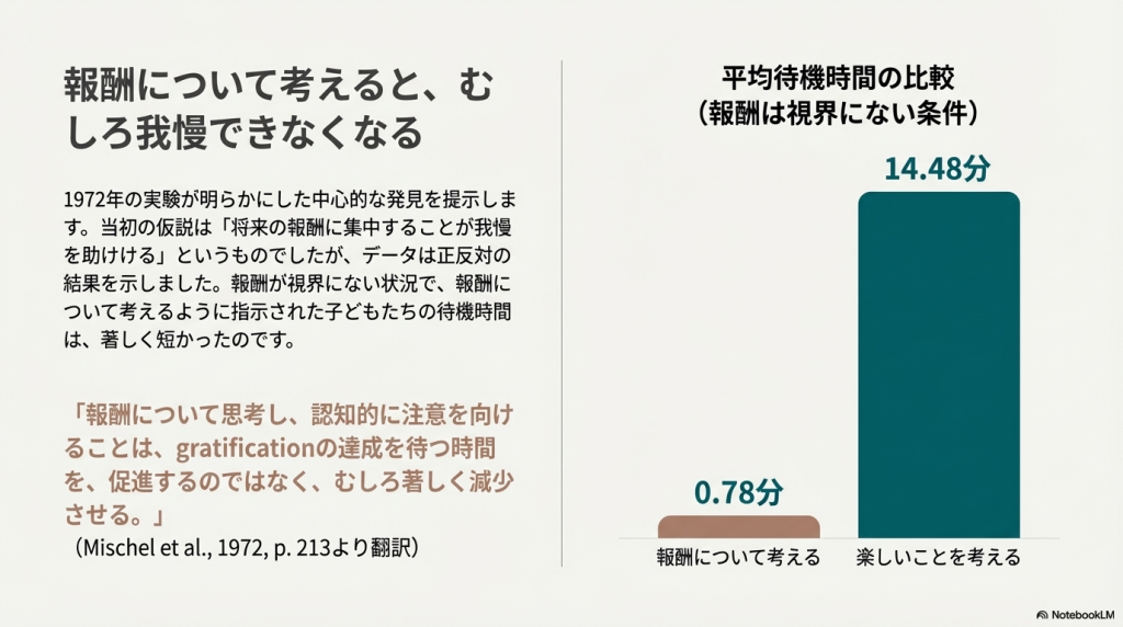 Mischel1972「報酬先延ばしにおける認知的・注意的メカニズム」:報酬を待つ間の子供たちの注意の向け方が待ち時間にどう影響するかを調査しました。報酬そのものについて考えるよりも「楽しいこと」を考えるなどの「自己変容(注意の逸らし)」が欲求不満を和らげ、待ち時間を延ばすのに最も効果的であることを明らかにしました。