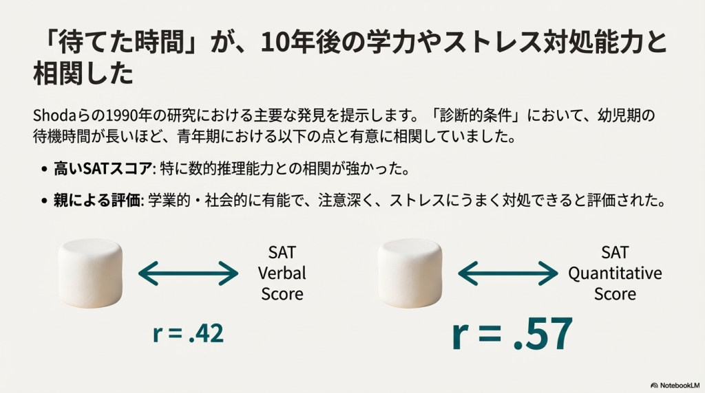 Shoda1990「就学前の報酬先延ばし行動からの、青年期の認知および自己制御能力の予測:診断的条件の特定」: スタンフォード大学のビング幼稚園での実験から約10年後の追跡調査です。報酬が露出しており、かつ対処戦略を教えられなかった「診断的条件(diagnostic condition)」において、就学前の待ち時間が青年期のSATスコアや社会的・認知的能力を予測することを報告しました。