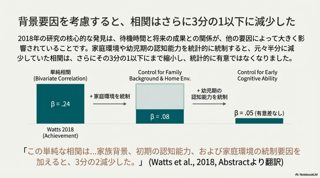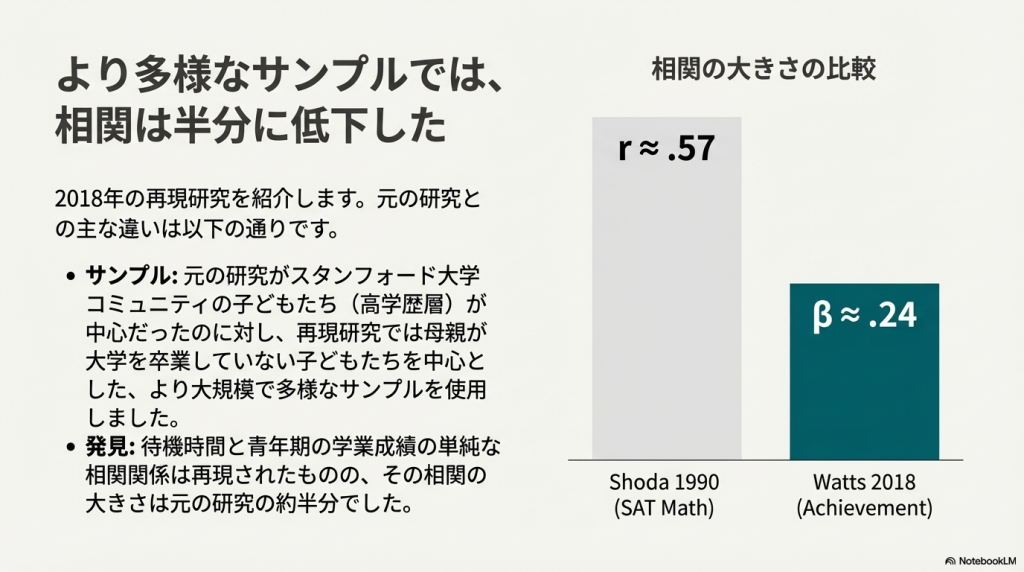 Watts2018「マシュマロテスト再訪:早期の報酬先延ばしと後の成果との関連を調査する概念的追試」: 1990年の研究に対する大規模な概念的追試(conceptual replication)です。NICHDの多様なサンプル(約900名)を用い、家族背景や初期の認知能力を統計的に制御すると、就学前の待ち時間が15歳時点の成果に与える影響は元の研究の報告よりも大幅に小さくなることを指摘しました。