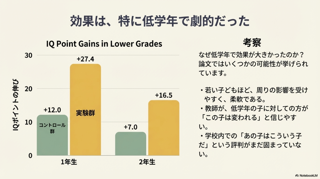 ソースによれば、なぜ低学年でより効果が高いのかについて、著者はいくつかの解釈を提示しています。例えば、「低学年の子供の方が可塑性が高く、変化しやすい(malleable)」、あるいは**「低学年の児童は学校内での評判が確立されていないため、教師が外部からの情報を信じやすかった」**といった可能性が挙げられています。