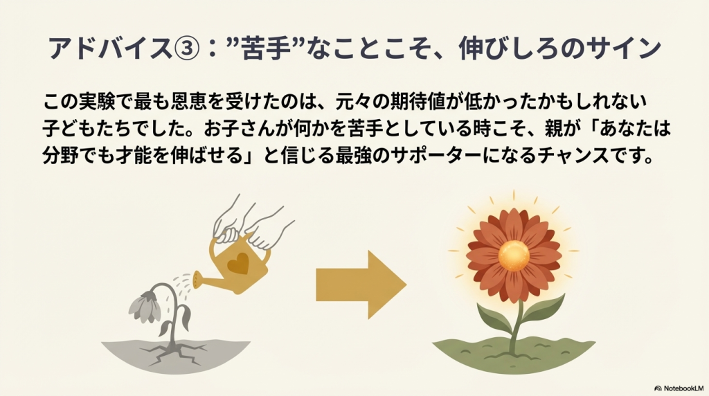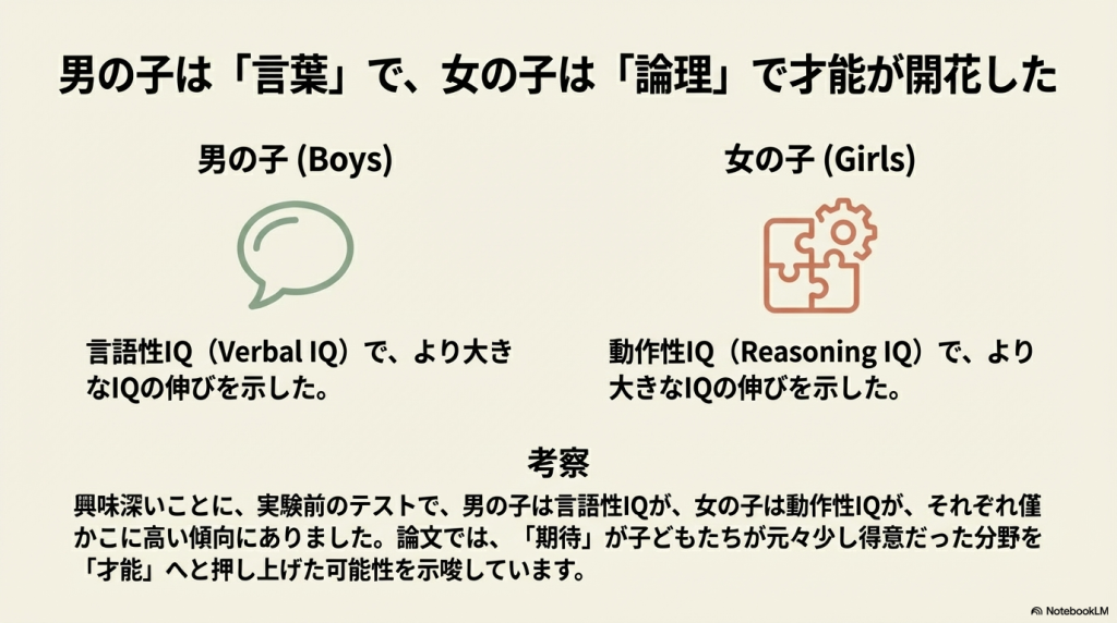 - 下位尺度: 言語IQと推論IQの両方で測定され、女の子は特に「推論IQ」において、教師の期待による劇的な向上(期待アドバンテージ)を示しました。
