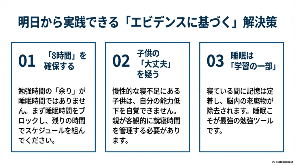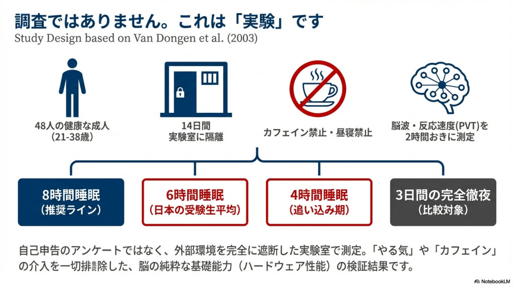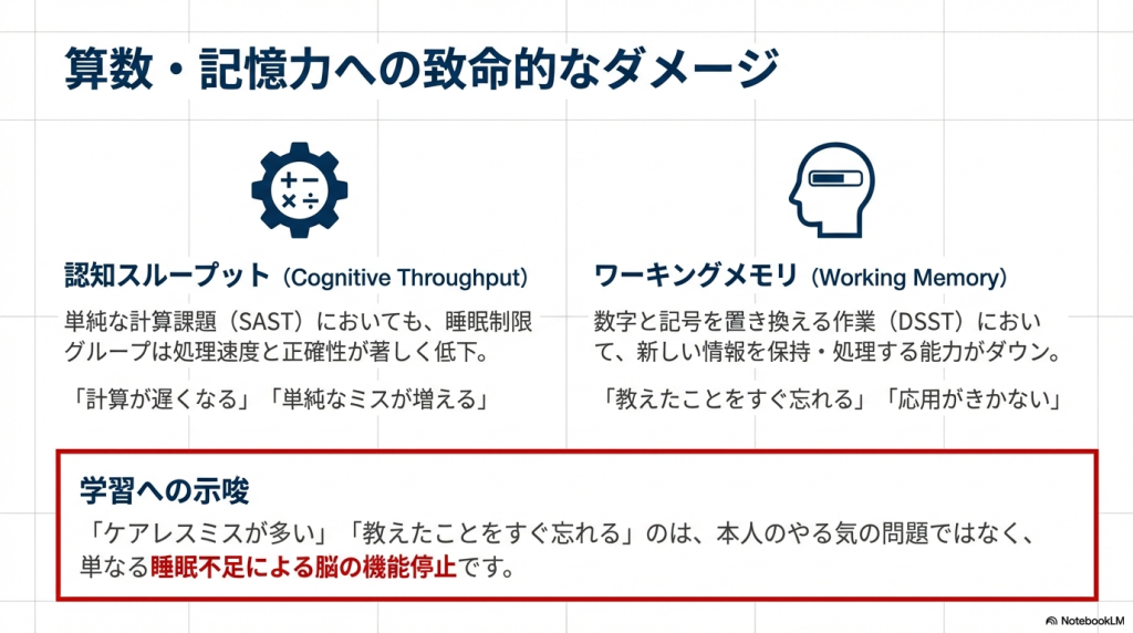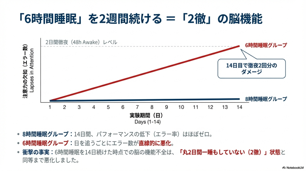 - 衝撃的な比較結果: 6時間睡眠を14日間続けた時点での認知機能の低下レベルは、「2晩の徹夜(完全断眠)」をした状態と同等であった 。4時間睡眠群ではさらに悪化し、3晩の徹夜と同等レベルに達した 。+2