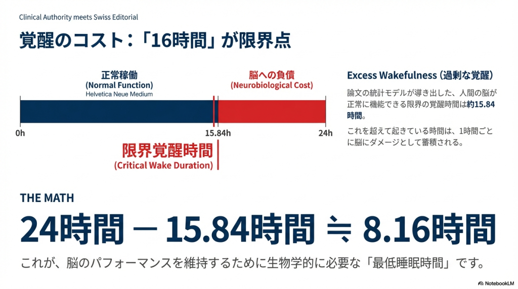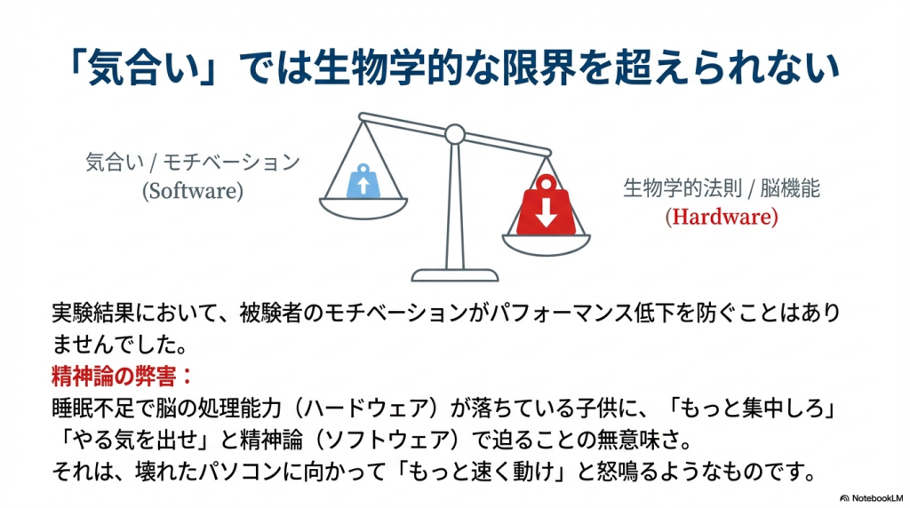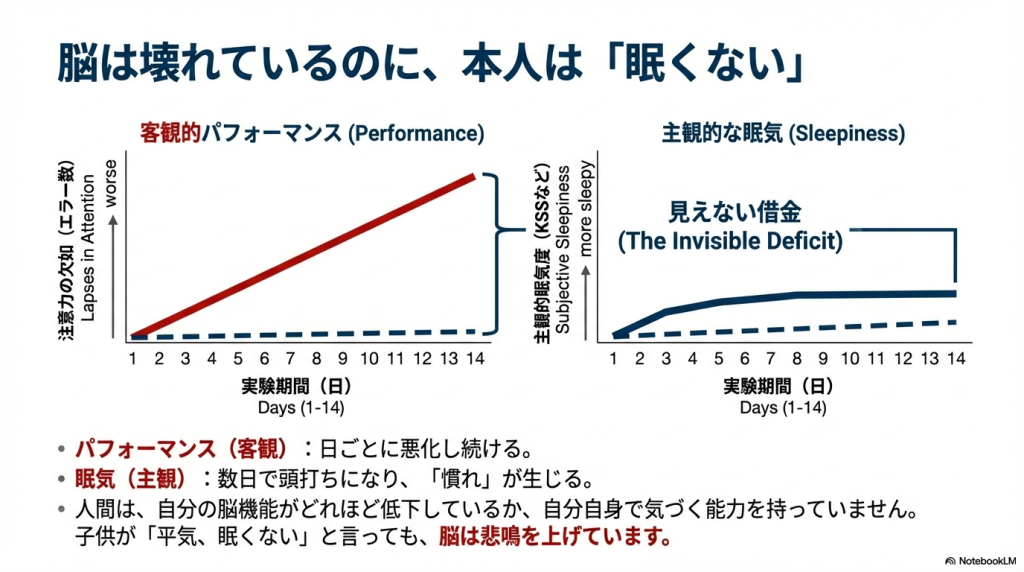 - 「辛くないから大丈夫」は脳の罠。(アウトカムの乖離:主観的な眠気は頭打ちになるが、脳機能は落ち続ける)