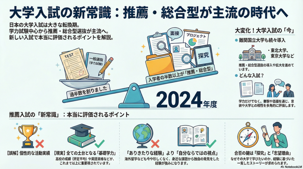 この流れを象徴するように、国立大学である東北大学は、将来的にすべての入試を総合型選抜などに切り替える方針を発表[1]しました。これは一時的なトレンドではなく、大学が求める学生像そのものが変わりつつある、大きな構造変化の表れと言えるでしょう。