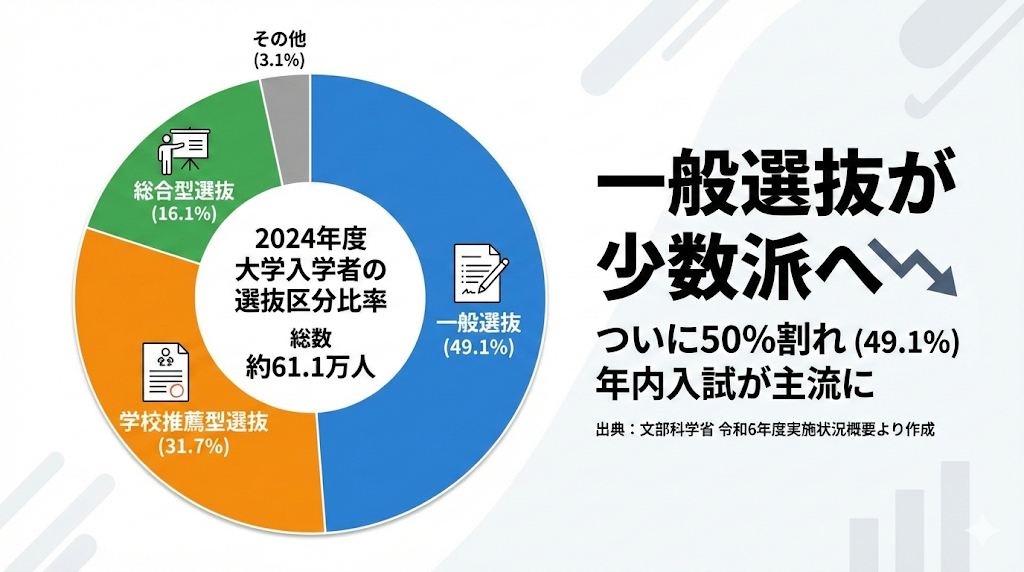 最も衝撃的な事実からお伝えします。現在、大学入学者のうち、いわゆる「一般入試(一般選抜)」で入学する学生は、もはや多数派ではありません。これは、受験が「短期決戦」ではなくなったことを示す何よりの証拠です。
