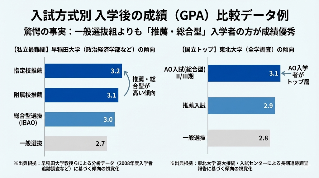 「推薦は学力が低い生徒の抜け道」という考えは、親世代に根強く残る固定観念です。しかし、データはこの常識を根底から覆します。東北大学や早稲田大学が公表したデータによると、驚くべきことに、総合型選抜(旧AO入試)で入学した学生の方が、大学での成績(GPA)が最も高いという結果が出ているのです。