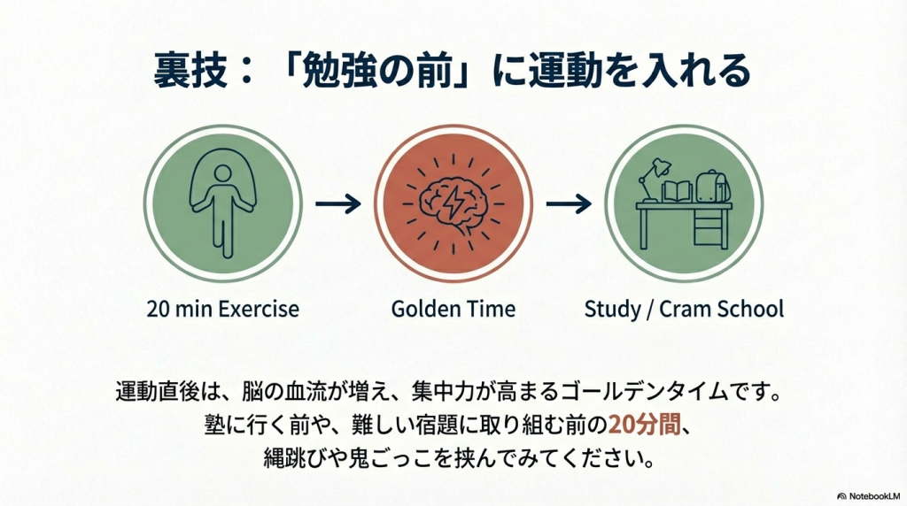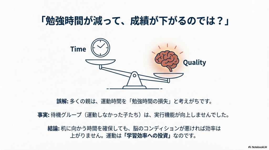 - ❌ 運動だけで成績が直接上がると断定はできない