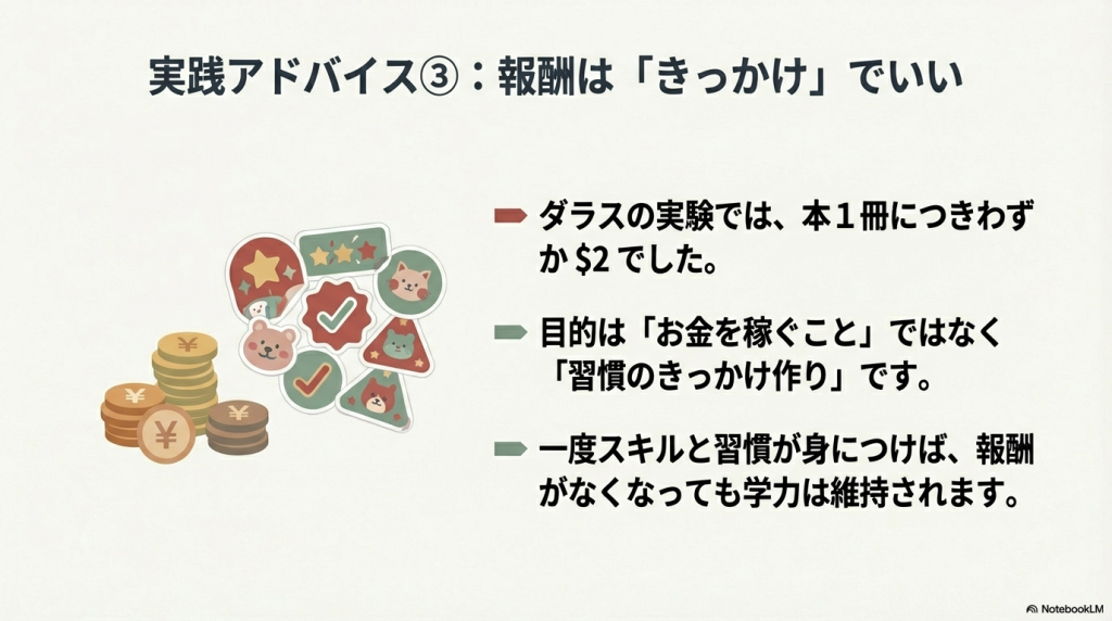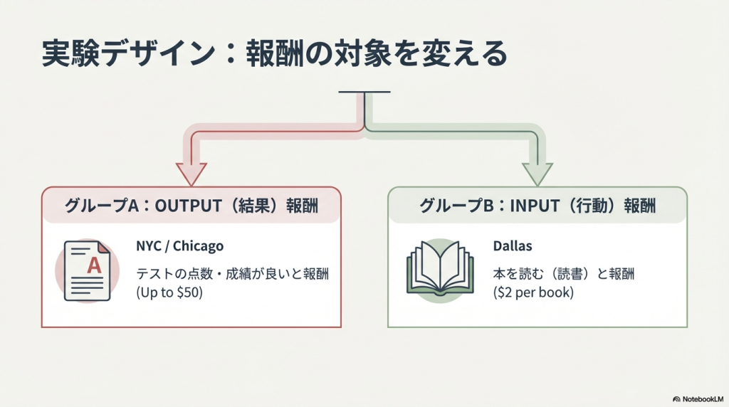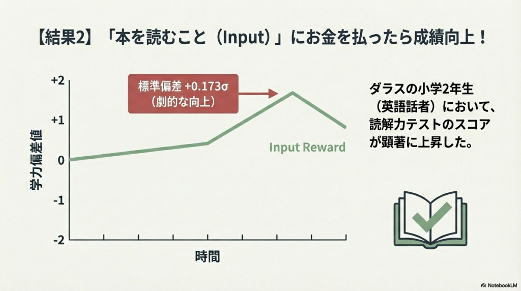 ニューヨークで莫大なお金を投じて、テストの点数と、本を何ページ読んだ過程とどちらにお金をあげたら生徒の成績が伸びたか調べたら、読書グループの方が成績が上がった!