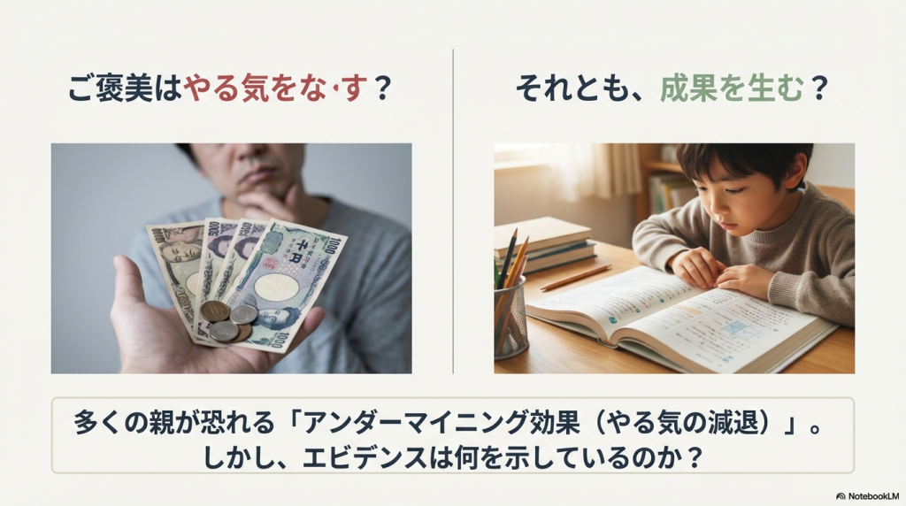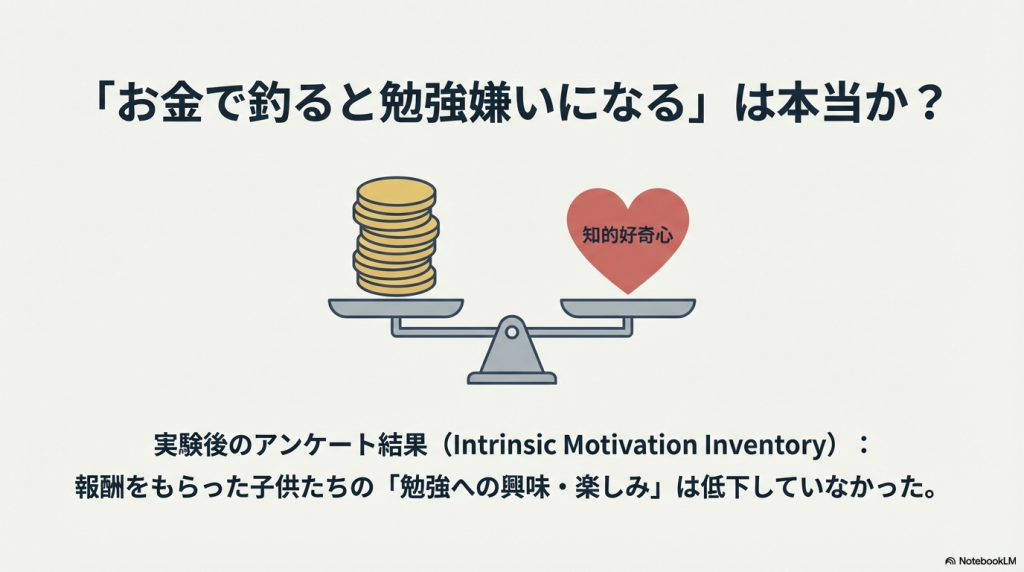 - 「内発的動機づけが下がるか」を正式に測定している点が非常に重要