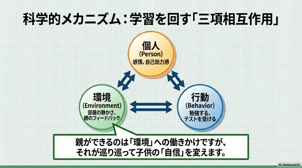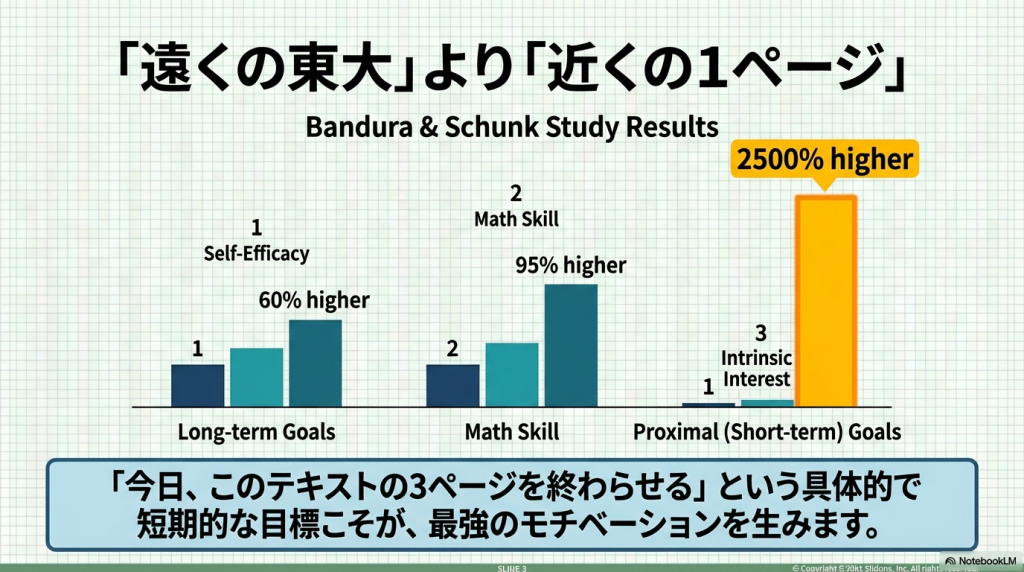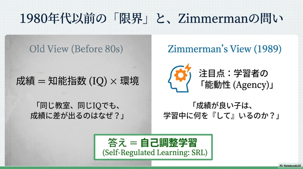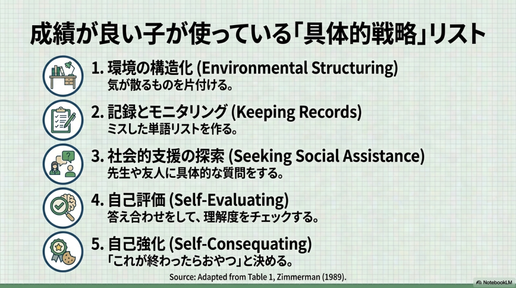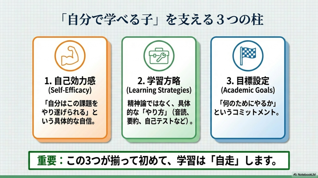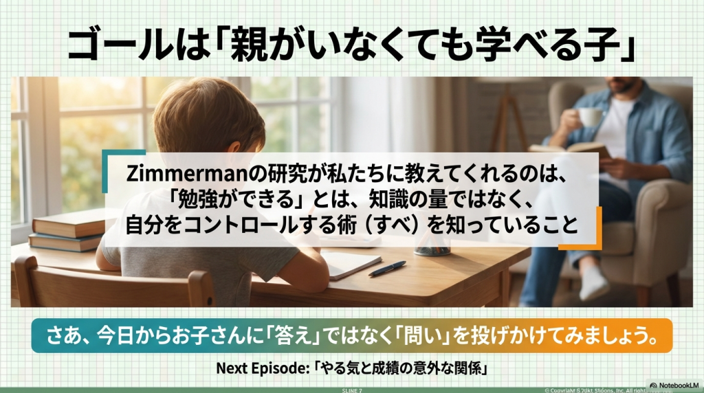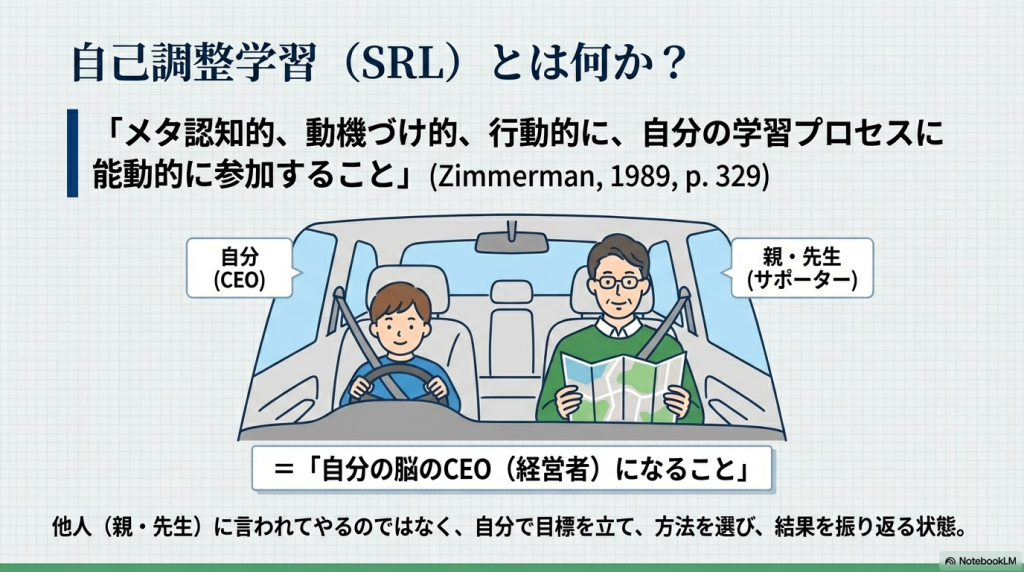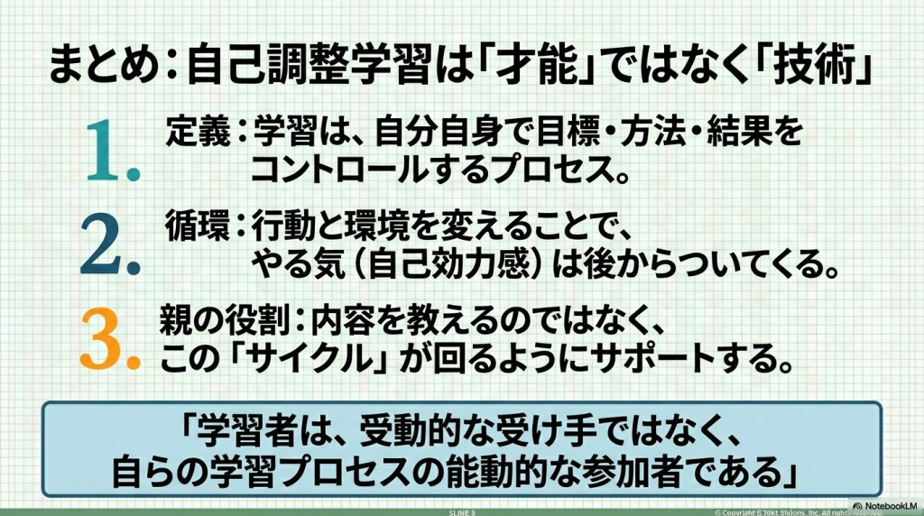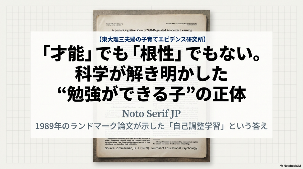 以前、「マンガでわかる けテぶれ学習法」という本を読んだことがあって、子供が自分で勉強する方法に興味を持っていました。ChatGPTに探してもらったら、「自己調整学習」という理論があることがわかり、原著論文も出ているらしいので、そのうちの最初の1個をNotebookLMに解説してもらいました。