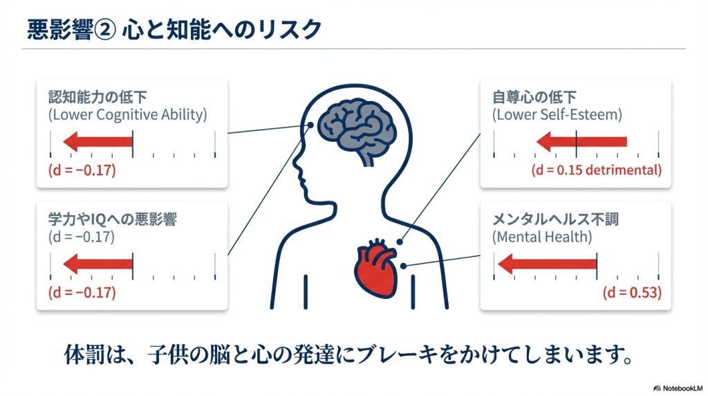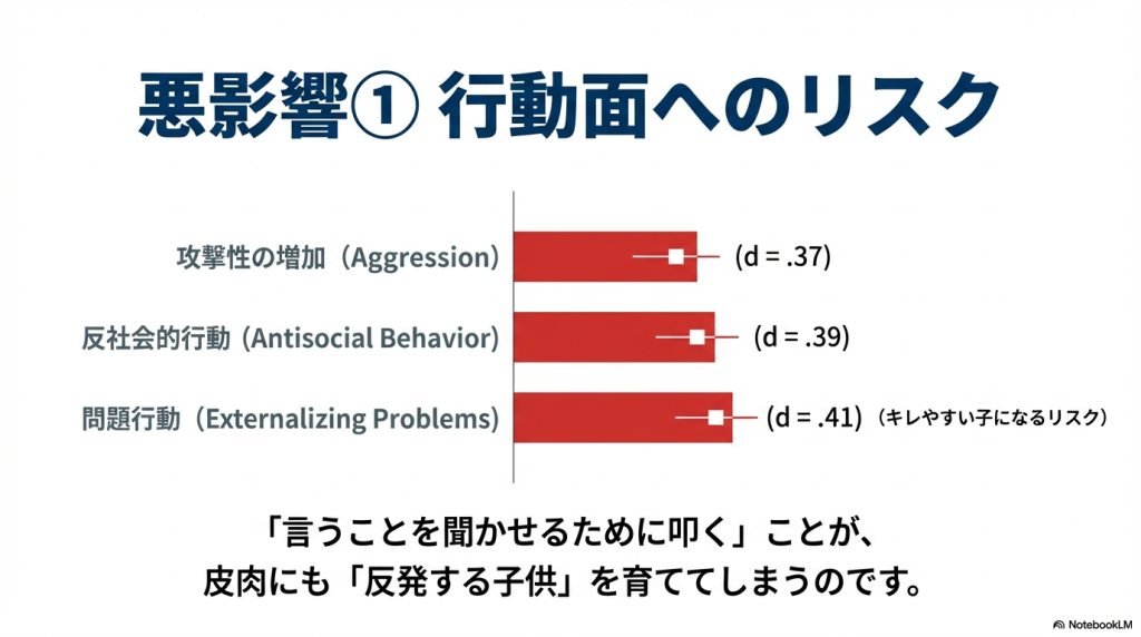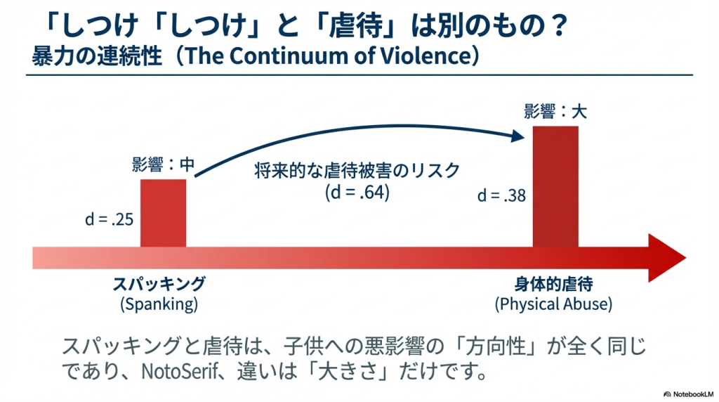 と思っていました。たしかに、子どもに自分の言うことを聞かせたい場合は、暴力は有効そうでしたが、いろいろな本を読んだりしているうちに、また、実際に子育てをしているうちに、つい最近(2024年前後)、言葉による暴力も、体罰も、子どもの成長には有効ではないのだなと感じるようになりました。日本で2024年に法律になっているくらいなのですから、エビデンスがあるはずだと思い、今回、見つけた論文がこちらになります。メタアナリシスですから、これは決定的と言ってよいと思います。