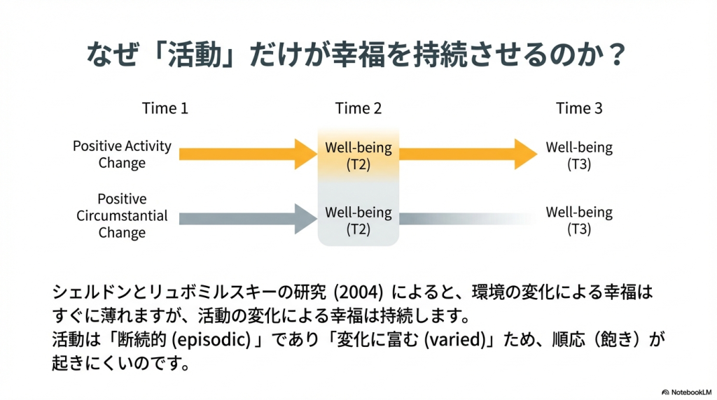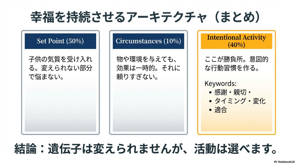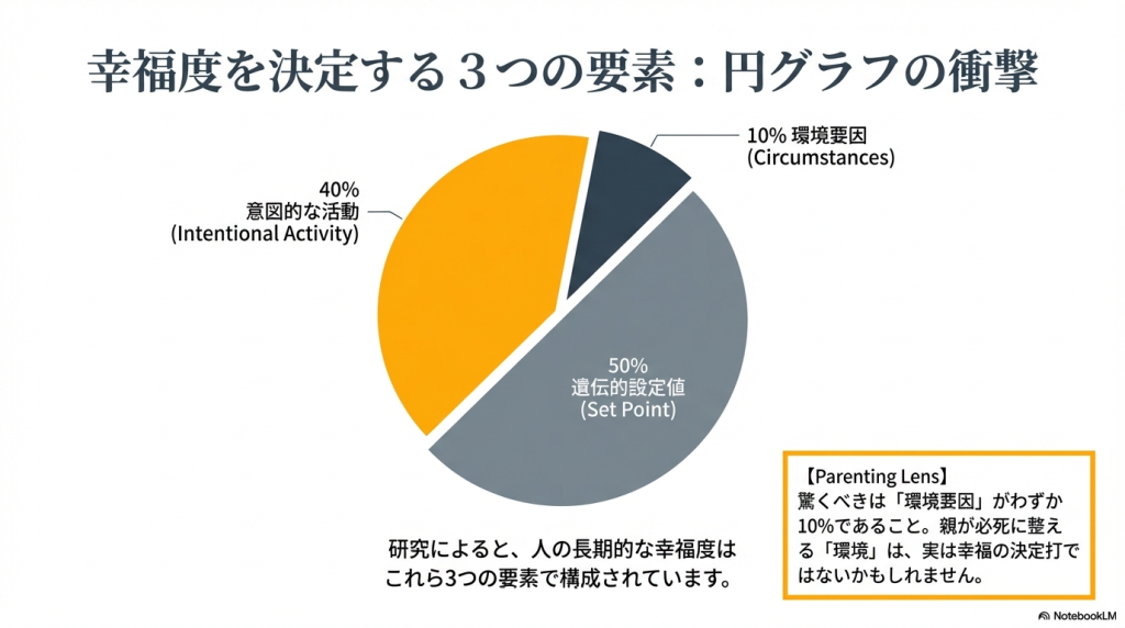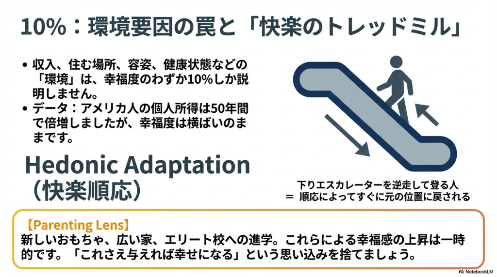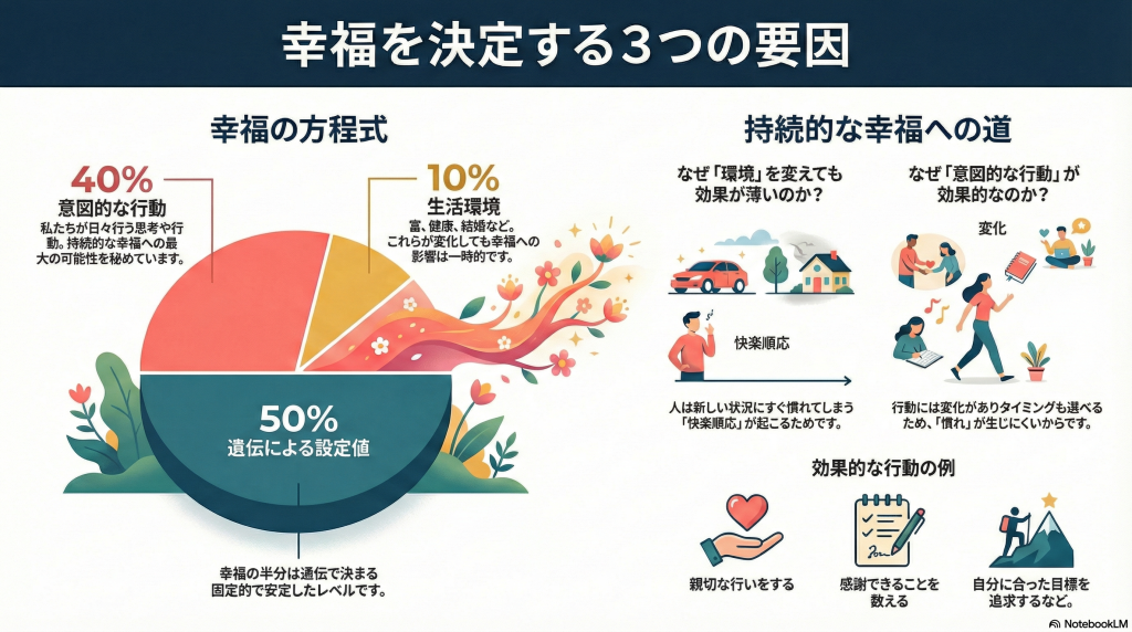 遺伝50% / 環境10% / 意図的活動40% - 環境は慣れる(hedonic adaptation)