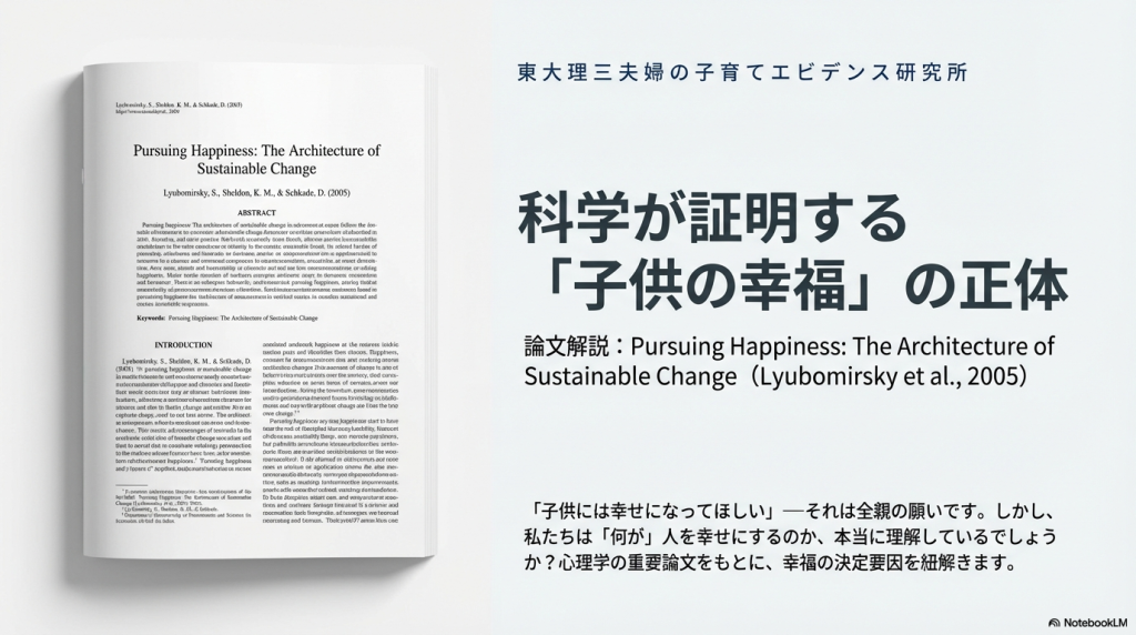 最近、ハッピーになりたくて、まんがでわかる 自己肯定感を高める ハーバード式ポジティブ心理学という本を読んでみました。そこに、「環境は幸福に10%しか影響を与えない」と書いてあったので、これに関する論文について、ChatGPTに聞いたら、今回の論文を見つけてきてくれました。