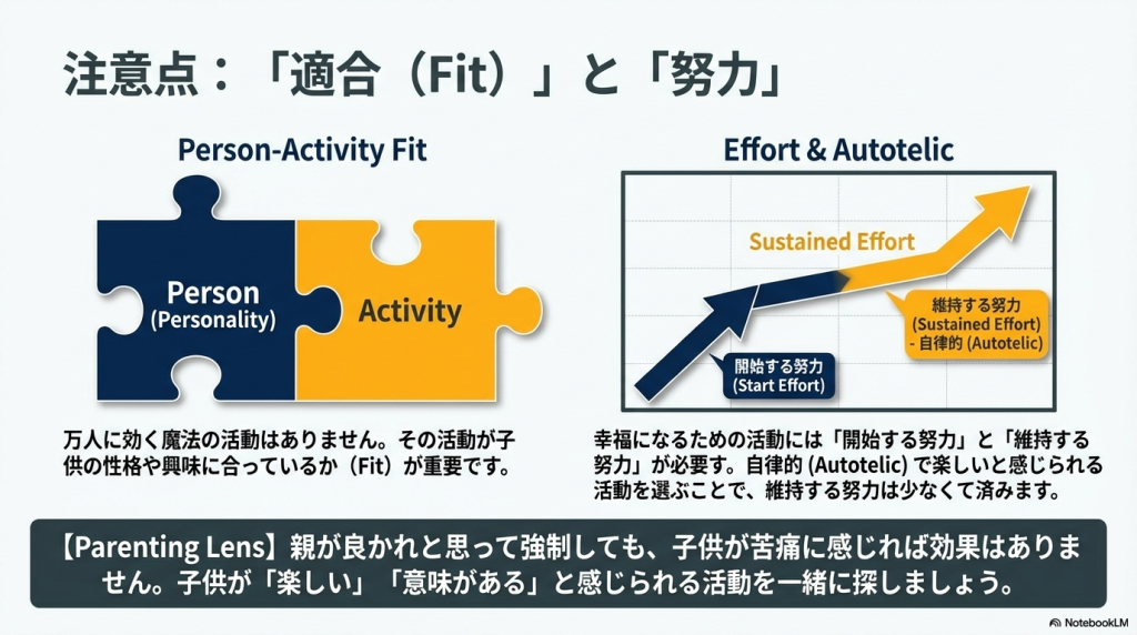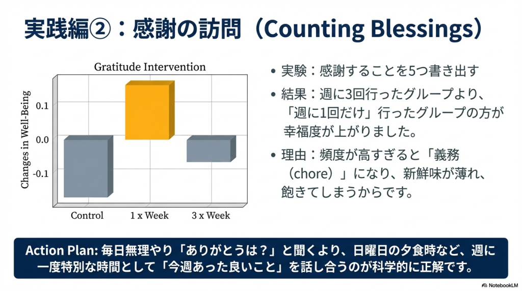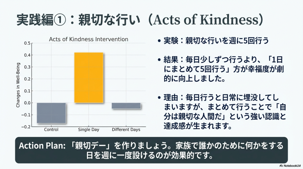 (例:感謝日記、親切行動、自己一致的目標の追求)