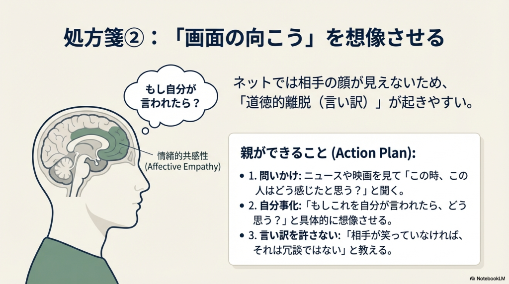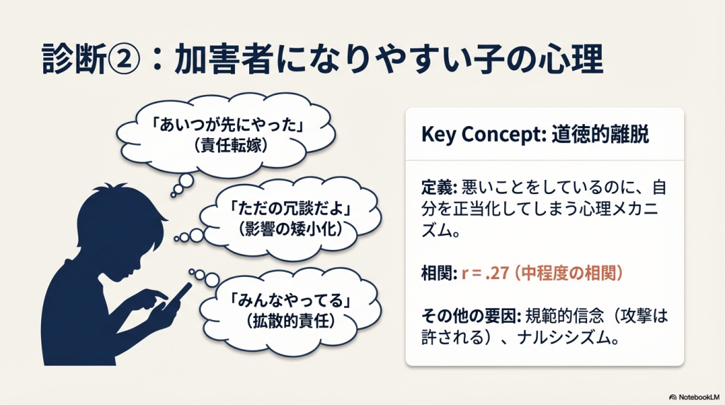 - 加害者:道徳的ブレーキの低下