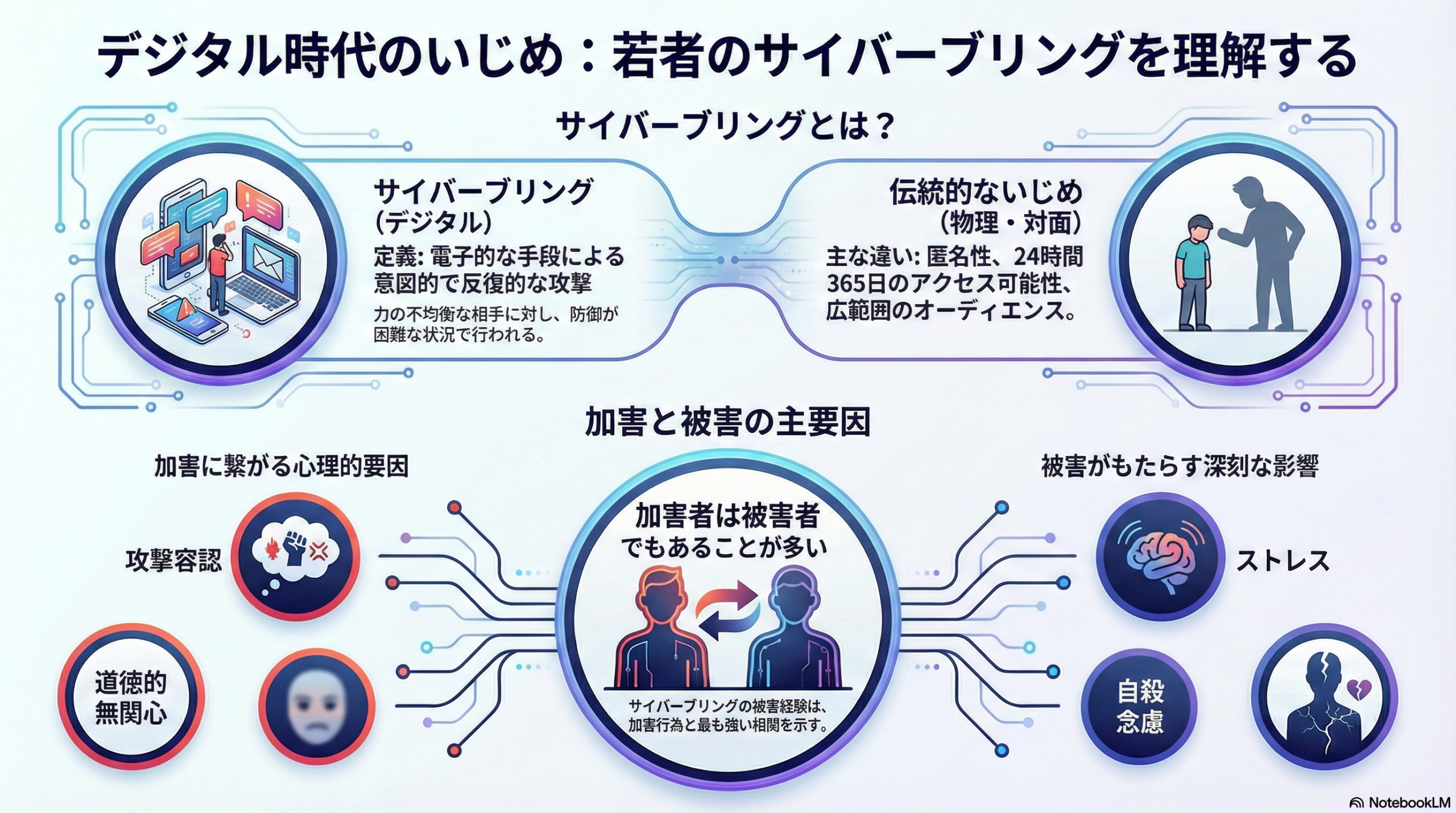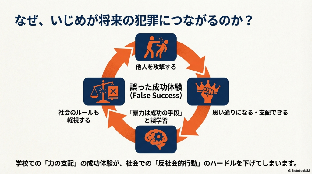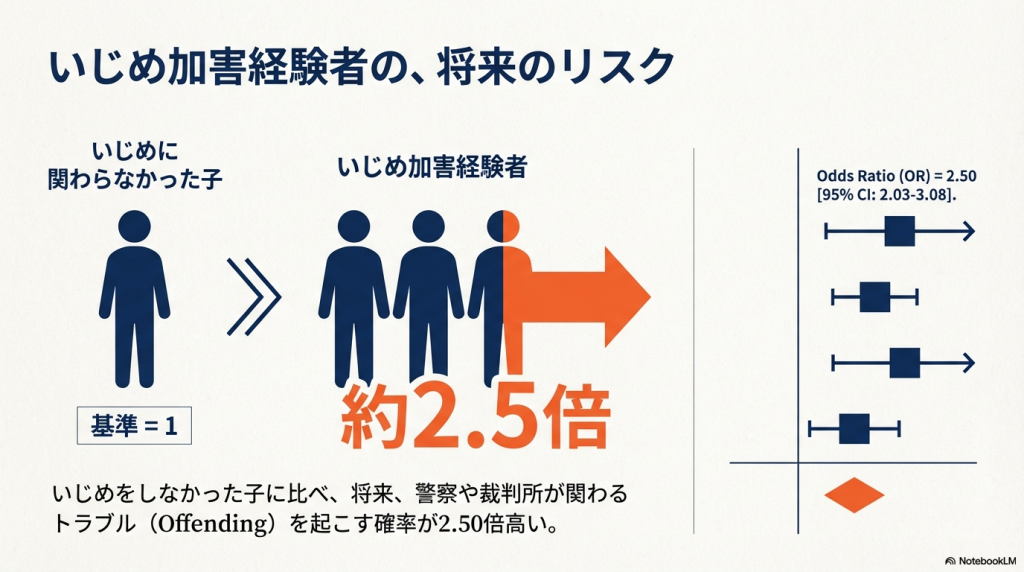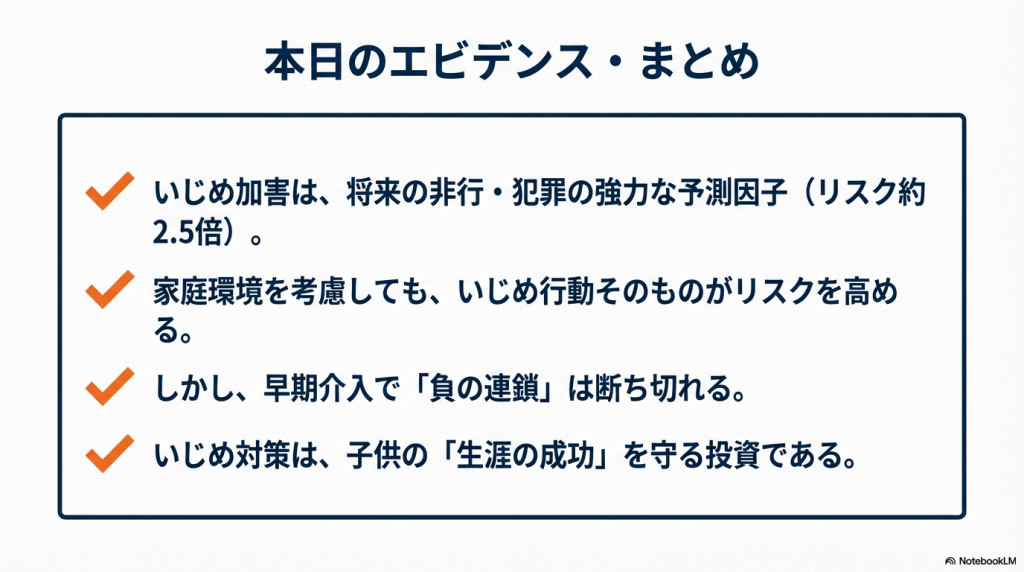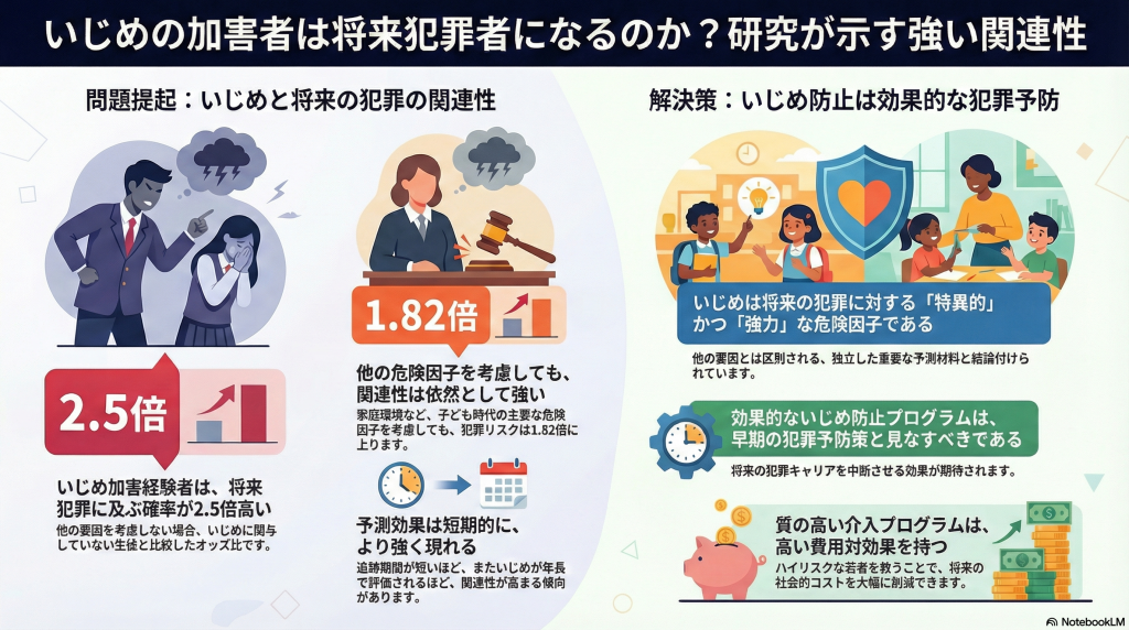 - 結論として「学校でのいじめ加害は、後のoffendingの強く、比較的特異的なリスク因子」とまとめ、いじめ対策は早期の犯罪予防になり得ると述べています cbm.808