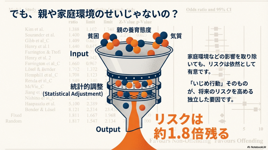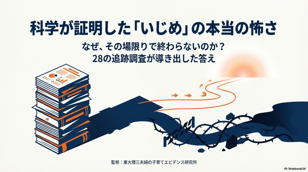 「いじめは“その場のトラブル”で終わらないことがあり、いじめ加害は将来の非行・犯罪のリスク上昇と関連していました(しかも、家庭環境などを考慮しても関連が残る)。」 cbm.808