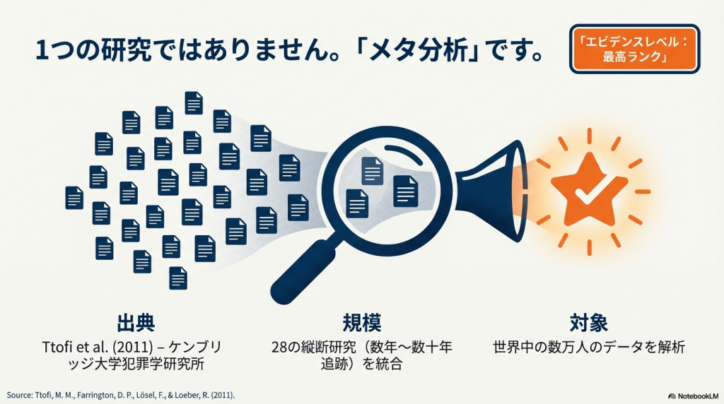 以下、アップロードいただいたメタ分析論文(Ttofi et al., 2011; DOI:10.1002/cbm.808)の PECO(暴露要因が中心なのでPICOよりPECOが自然) で整理します。