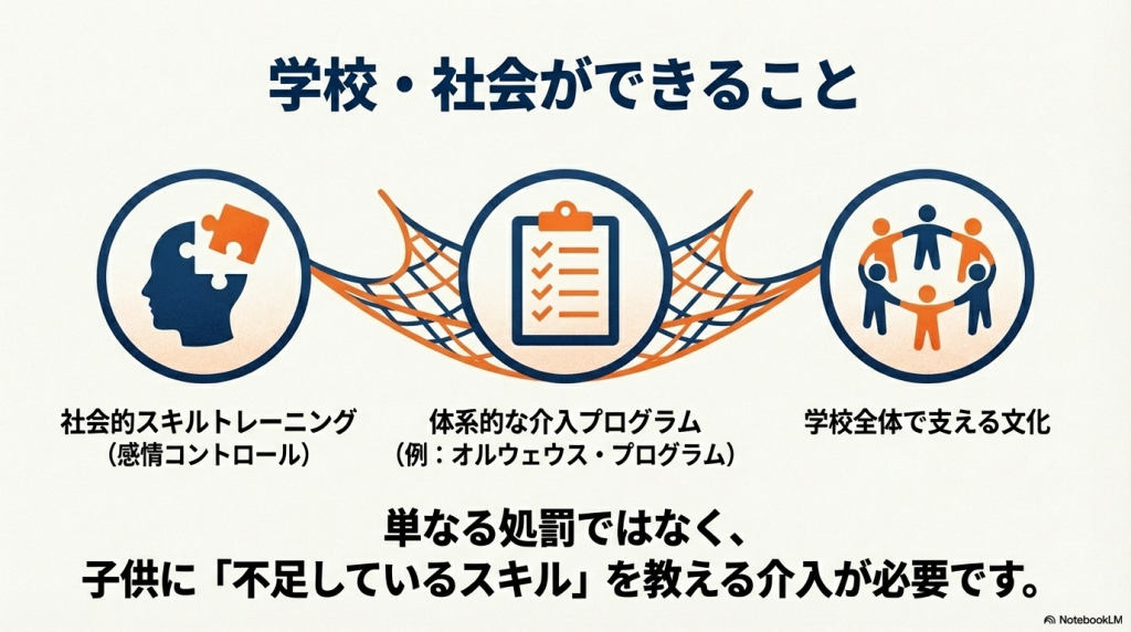 - 学校全体の長期取り組み(例えば、フィンランドのKiVaプログラムなど)により、いじめは減らすことができる(エビデンスあり)