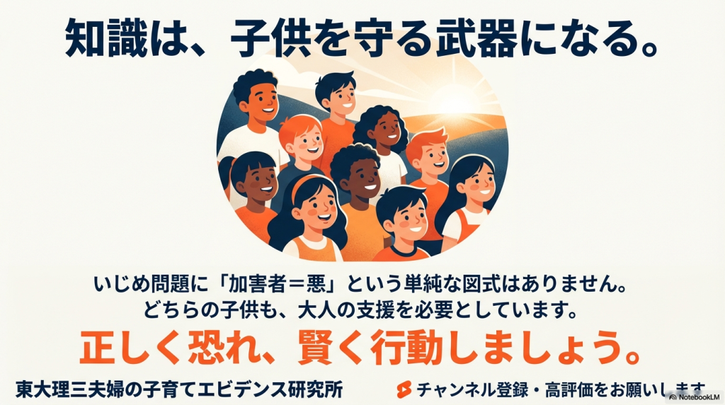 - 加害者の「シンキングエラー」と、被害者と加害者の間の「アンバランスパワー」のために、いじめをやめるためには、いじめ早期に「傍観者」が、いじめ被害者の「擁護者」になって加害者にいじめをやめさせることが重要。