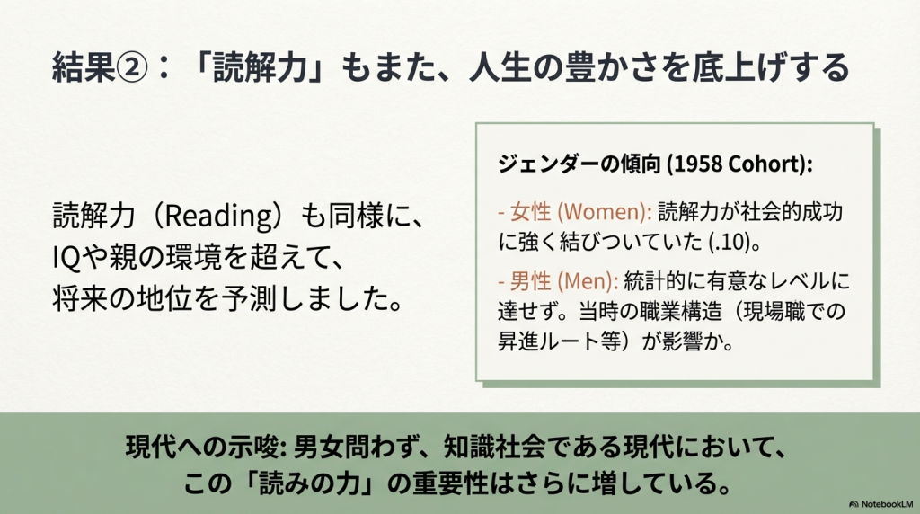 - 読解力:女性でより強い直接効果