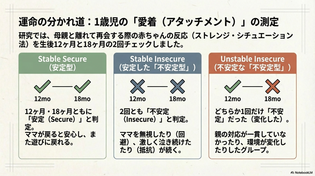 という、ミネソタ親子研究(The Minnesota Study)の論文を見つけてくれましたので、その解説をNotebookLMにやってもらいました。なお、子供の「愛着(アタッチメント)」の4分類については、以下をご覧いただけましたら幸いです。