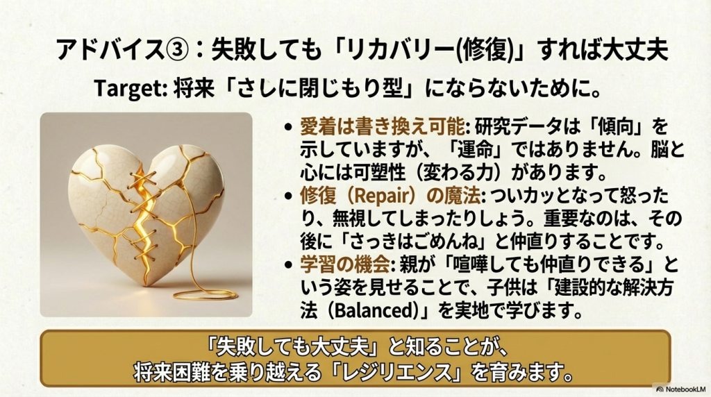 - ❌「愛着が悪いと一生ダメ」