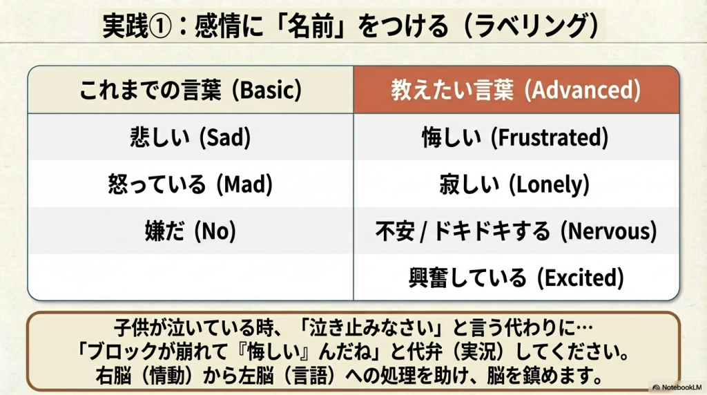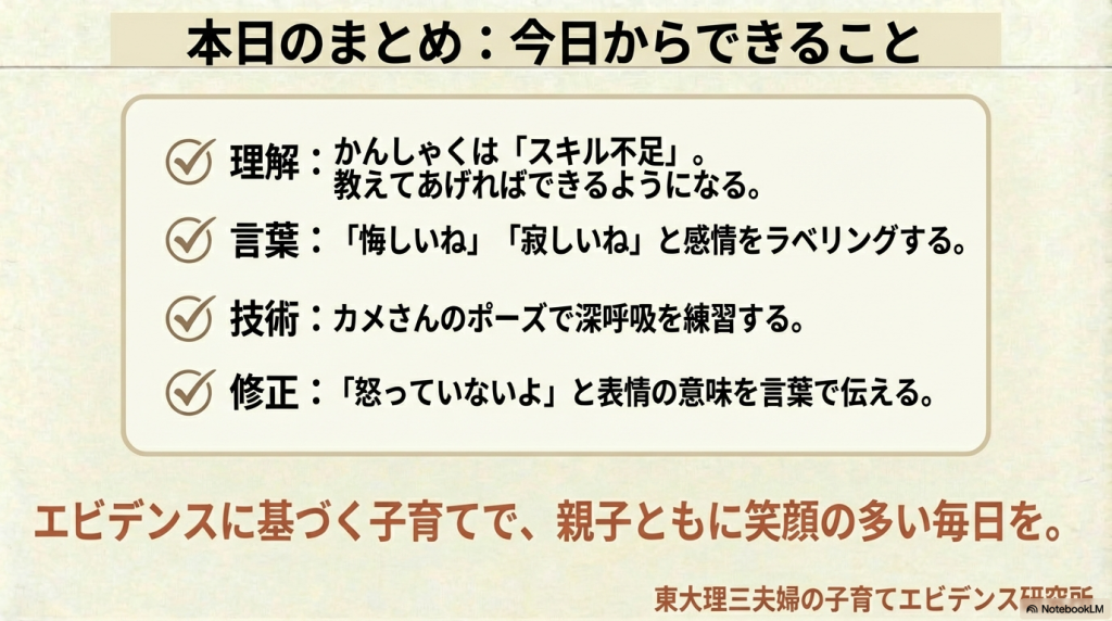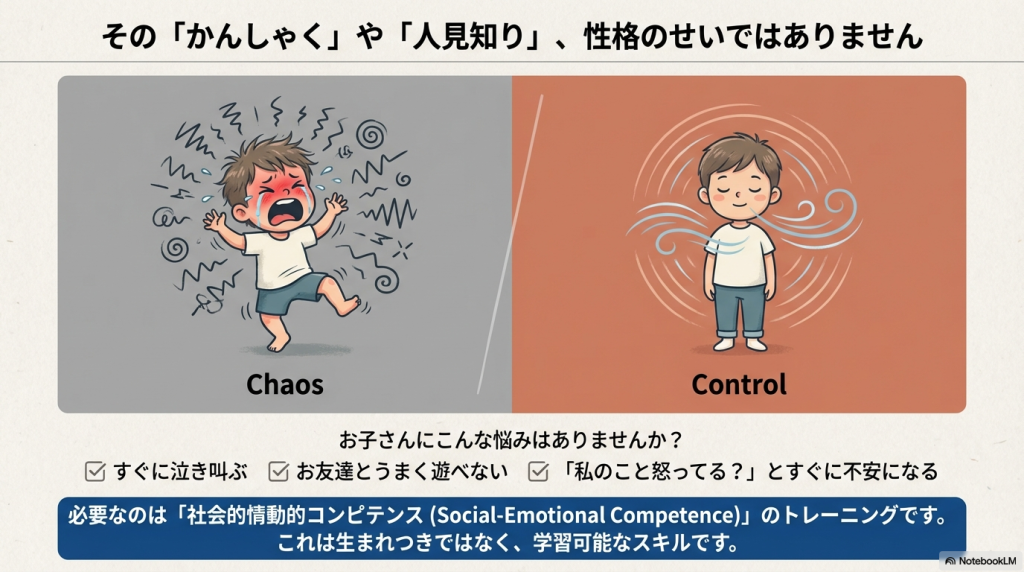 わが子の「かんしゃく」をどうしたら治す、または軽減させることができるのか、悩みの種です。Google Geminiに、就学前の子どもが感情コントロール能力を高めるための具体的なアプローチについてエビデンスについて調べてもらったところ、以下の3つを挙げてくれました。