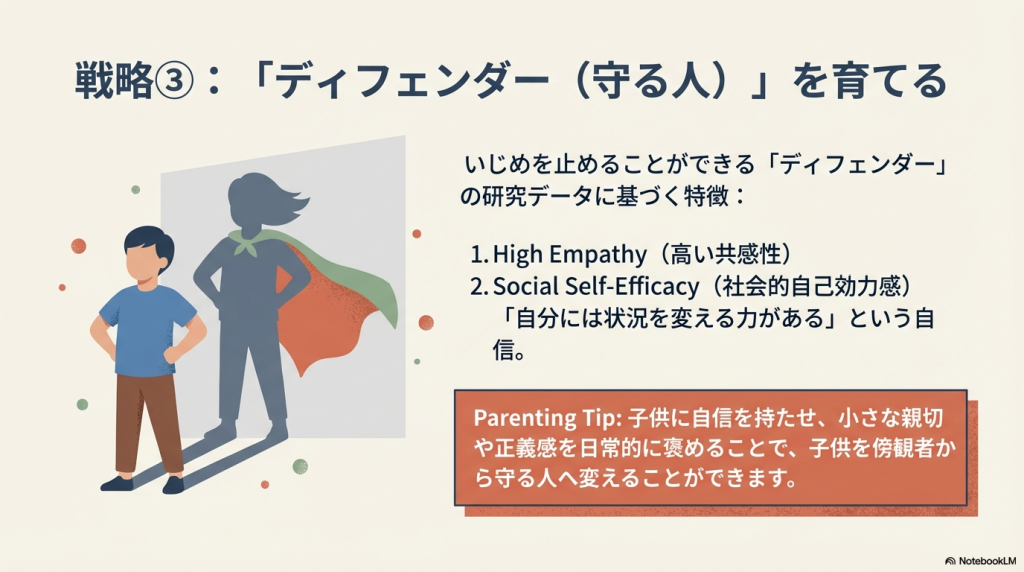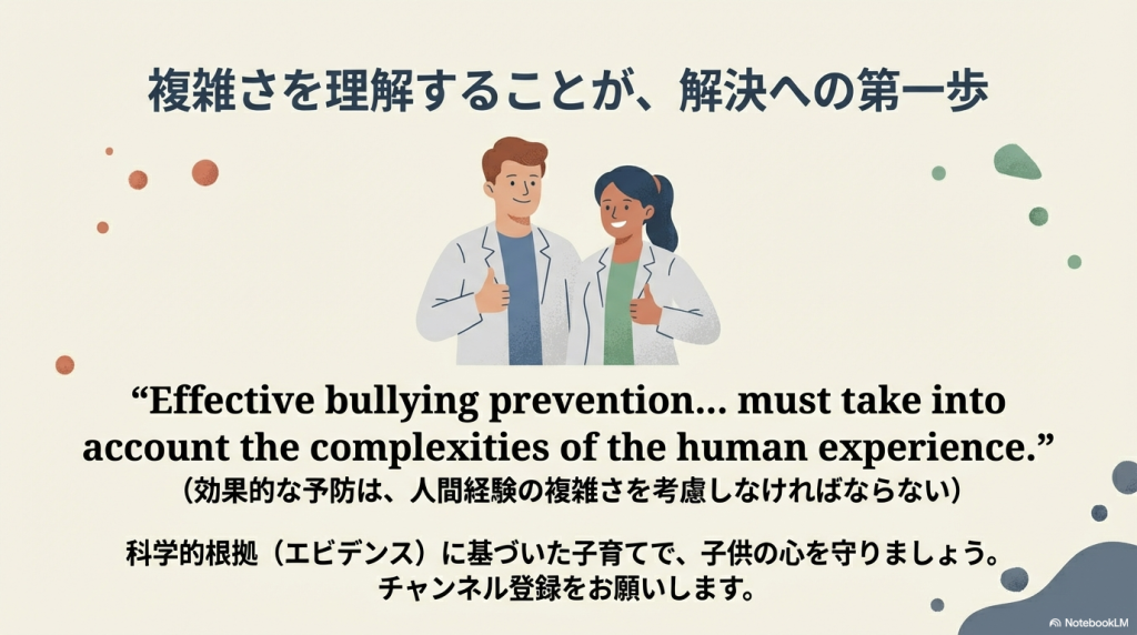 の2つにより、加害者、または被害者が自発的に初期のいじめをやめることは事実上困難とのことでした。つまり、いじめの初期対応のカギは、「傍観者」なのだそうです。ストレスの少ない環境作り、傍観者がすぐに擁護者(いじめ被害者を擁護する人)になれるような教育が、いじめの深刻化を妨げるために有効であるというのが今回の論文です。学校での教師の実際の対応については、上のマンガ「いじめと戦う!プロの対応術 ~マンガで解説~」がわかりやすいです。