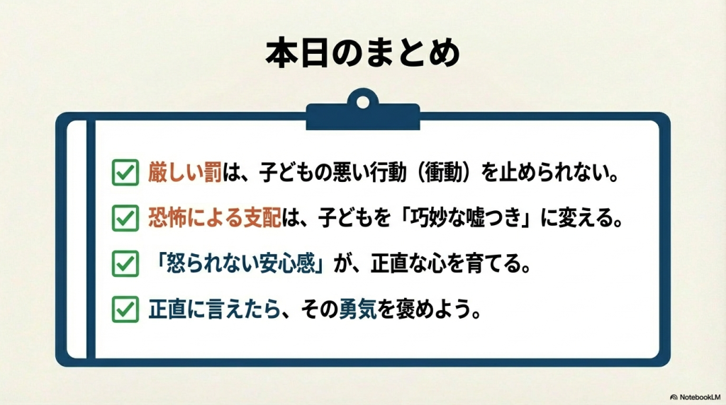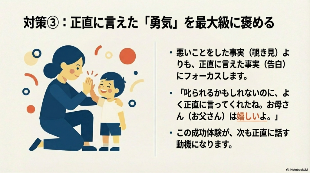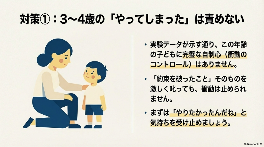 と怒ってしまいました。この言い方は、今回の論文的には、将来、子どもが嘘をつかなくなることに対して、「効果無し」だそうです。がーん。