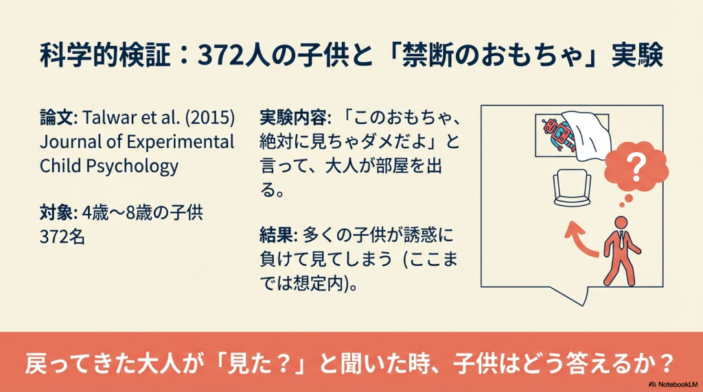- 実験室場面で「してはいけない行為(おもちゃをのぞく)」をした後